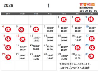 2025年12月営業日のお知らせ スカイセブンモバイル太田店