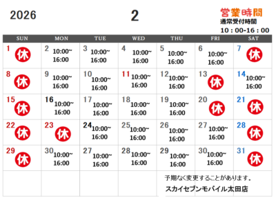 2026.2月営業日カレンダー スカイセブンモバイル太田店